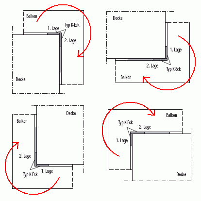Aufgrund der Lage des Absetzpunktes ist es sinnvoll, die Verlegung der Körbe mit Blickrichtung auf die Außenseite der Decke bzw. Wand von rechts nach links zu erzeugen. Die Außenseite des Einbauteils (Balkonseite) ist durch ein Dreieckssymbol gekennzeichnet und liegt beim Absetzen des Korbes zunächst unten.