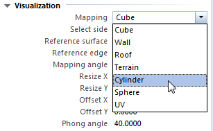 Select the 3D object of which you want to change the mapping type and open the Properties palette. You can change the Mapping type in the Visualization area.