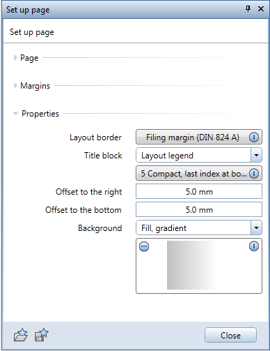 Using the settings in this area, you can define the layout border, title block and background as fixed properties of the page. The layout border matches the size of the page. For the title block, you can specify the distance from the inner margin of the layout border. You can use a fill or texture for the background. When you change the page, the size of the layout border and the position of the title block adapt automatically.