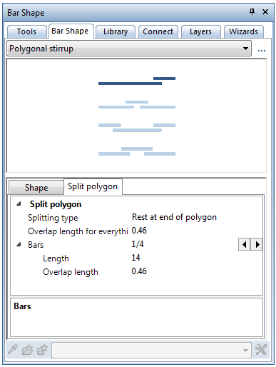 Options and the bending shape is not created per meter, the program will split the polygons of the shape. The Split polygon tab appears, where you can define the splitting type, the general overlap length and the length and overlap of the individual bars. The overlaps can only be implemented as straight bars.