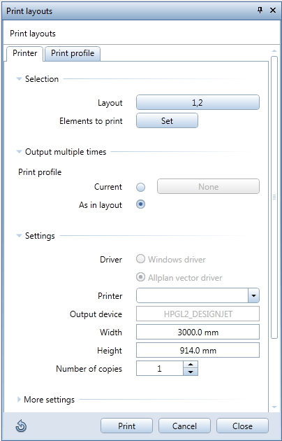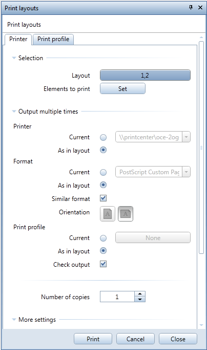 The settings for using the print profile are new. With the As in layout setting, you can change the parameters on the Print profile tab temporarily for the current layout but you cannot select a print profile. With the Current setting, you can select a predefined print profile. You can check its parameters on the Print profile tab but you cannot change them temporarily.