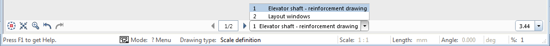 takes you to the next layout. You can use the list box to select a layout of your choice. If you have set a Windows driver for the current layout and you have selected several layouts with Allplan vector drivers, the program will issue a message announcing that the layout in question cannot be displayed and remove it from the layout selection. When you have selected the As in layout setting for the printer, format and/or print profile in conjunction with Windows drivers, the corresponding definition is displayed in the palette.