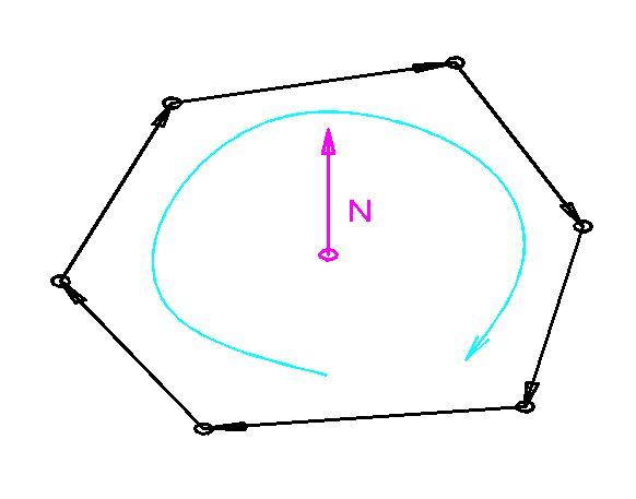 The area, which is the smallest unit, consists of edges (lines) that are internally defined in a clockwise direction (right-handed coordinate system). The surface normal always points outwards.