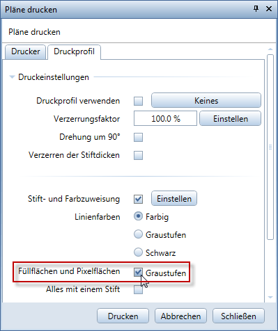 Bisher wurden Füll- und Pixelflächen auf Farbdruckern immer farbig ausgegeben, sofern nicht im Drucker selbst die Schwarzweiß Ausgabe eingestellt war. Nun können Sie bei der Ausgabe von Plänen mit den Funktionen