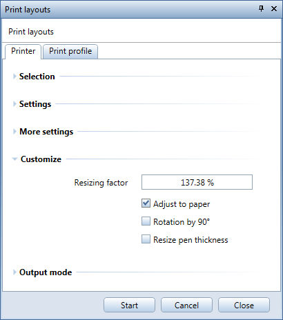 If you have selected Adjust to paper, the resizing factor adapts automatically when you change the format or orientation of the page or the format or orientation of the paper used by the output device. In order to calculate the resizing factor, the program always adjusts the page to the paper used by the output device. Allplan no longer rotates the layout automatically by 90°.