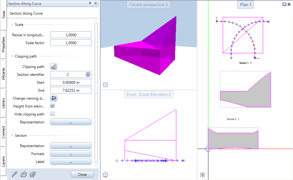 Start by defining the parameters for the Scale, Clipping path and Section in the Section Along Curve palette. Then click the 2D element for the clipping path in plan and select the viewing direction by clicking in the workspace.
