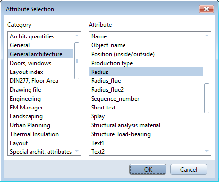 You can find the Radius attribute in the General Architecture category. This new attribute returns the values in millimeters. If you want to analyze the Radius attribute, you can add it to label styles or reports.