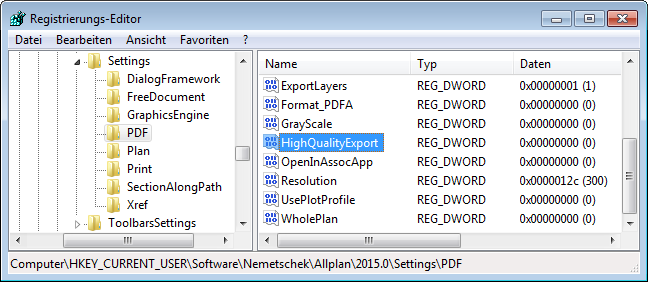 Start the registry editor by clicking the Windows icon at bottom left. Type in regedit. Go to HKEY_CURRENT_USER -> Software -> Nemetschek -> Allplan -> 2015.0 -> Settings -> PDF. Open the HighQualityExport value on the right by double-clicking it. Then change the value from 0 to 1.