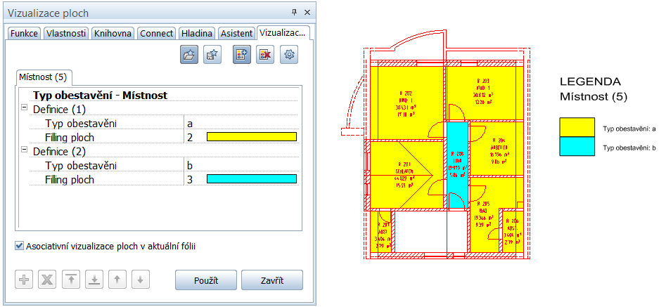 Vizualizace ploch. Pokud je u existující legendy aktivována volba Asociativní vizualizace ploch v aktuální fólii a element je vytvořen pomocí kritéria, které ještě není ve vizualizaci ploch obsaženo, dojde nyní automaticky k doplnění položky s tímto kritériem a nový element je automaticky převzat do legendy.