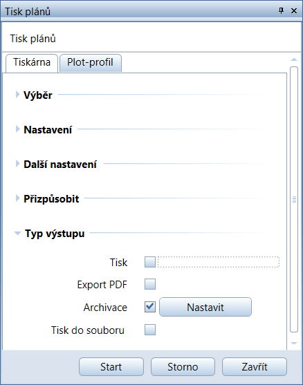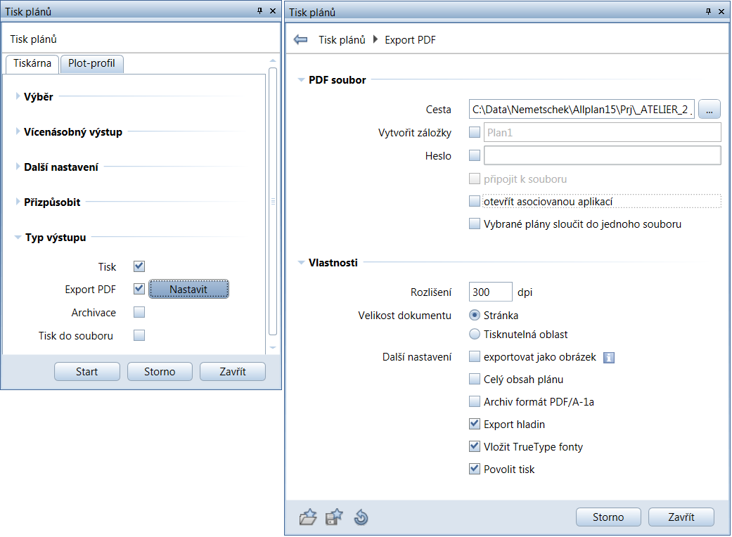 V oblasti Typ výstupu můžete nyní dodatečně zvolit Export PDF a provést tak v jednom kroku výstup plánu v několika výstupních médiích. Po aktivaci nastavení výstupu můžete stanovit parametry pro Export PDF tím, že kliknete na tlačítko Nastavit.