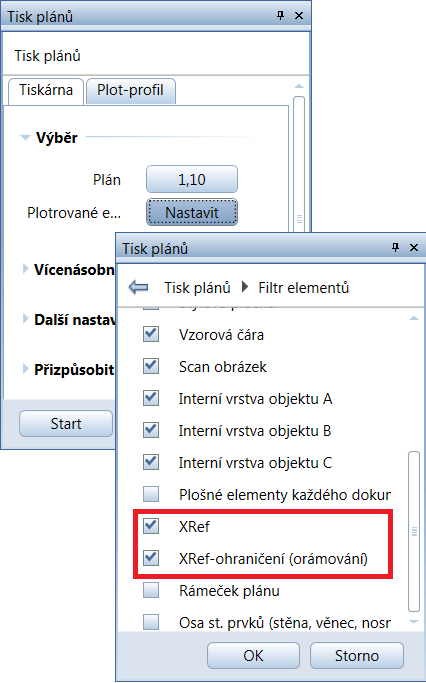 Na četná přání zákazníků můžete nyní ve funkci Výstup plánů upravovat v elementech určených k výstupu výstup XRefu a/nebo XRef-ohraničení.