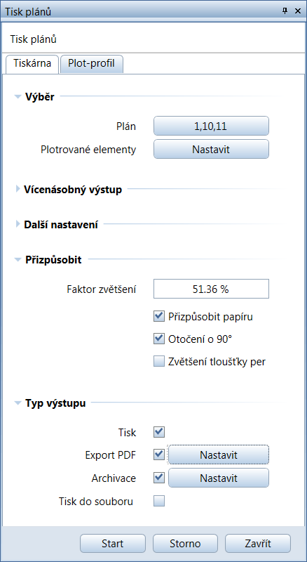 Rozšíření k přizpůsobení velikosti a orientace výstupu a také rozsahu výstupu plánu máte k dispozici také ve vícenásobném výstupu, přičemž je nutné určit nastavení v oblasti Přizpůsobit pro každý plán samostatně.