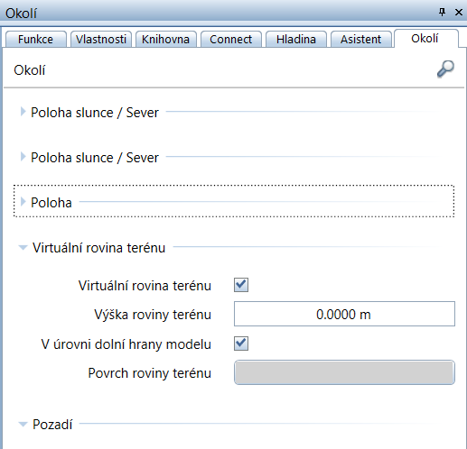 Výšková poloha roviny terénu se zadává v metrech. Pomocí volby V úrovni dolní hrany modelu se rovina terénu automaticky přizpůsobí aktuální dolní hraně stavebního dílu.