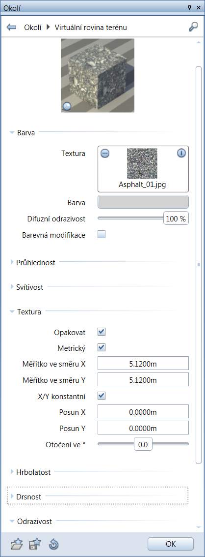 Povrch Virtuální roviny terénu lze různě definovat, od barvy fillingů až po textury s reliéfem, drsnost, lesk, průhlednost a svítivost.