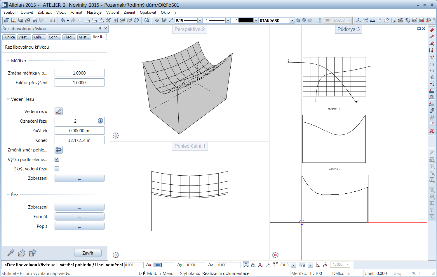 Řez libovolnou křivkou vytvoříte řez bez hloubky řezu podél libovolného 2D elementu.