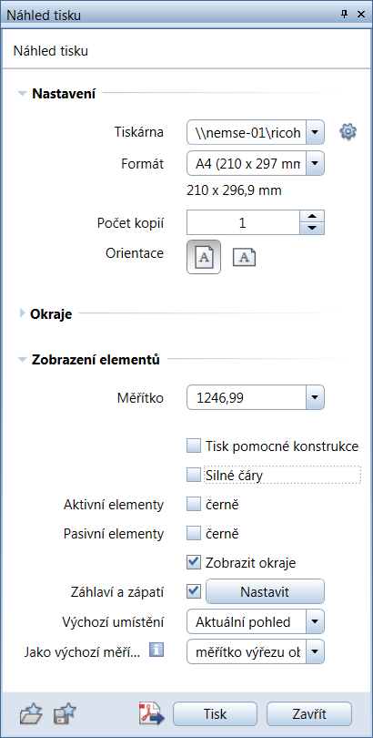 Vytisknout obsah okna byla přizpůsobena výstupu plánů. Stanovení nastavení se nyní provádí v paletě, díky čemuž jsou změny okamžitě viditelné. Ve srovnání s předchozí verzí můžete v záhlaví a zápatí použít pro obrázek libovolný typ souboru. Zobrazí se nastavený font textu záhlaví a zápatí. Výška záhlaví a zápatí se již nevytváří ze zadané hodnoty s odečtením okrajů, ale stanovuje se jako skutečná.