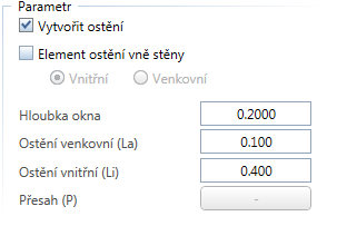 Pokud má mít okno přesah na vnější straně stěny, lze požadovaný přesah přičíst k hodnotě Ostění vnitřní. Hodnota Ostění vnitřní může činit maximálně tloušťka stěny + hloubka okna. Tím vznikne záporná hodnota pro Ostění vnější v hodnotě přesahu.