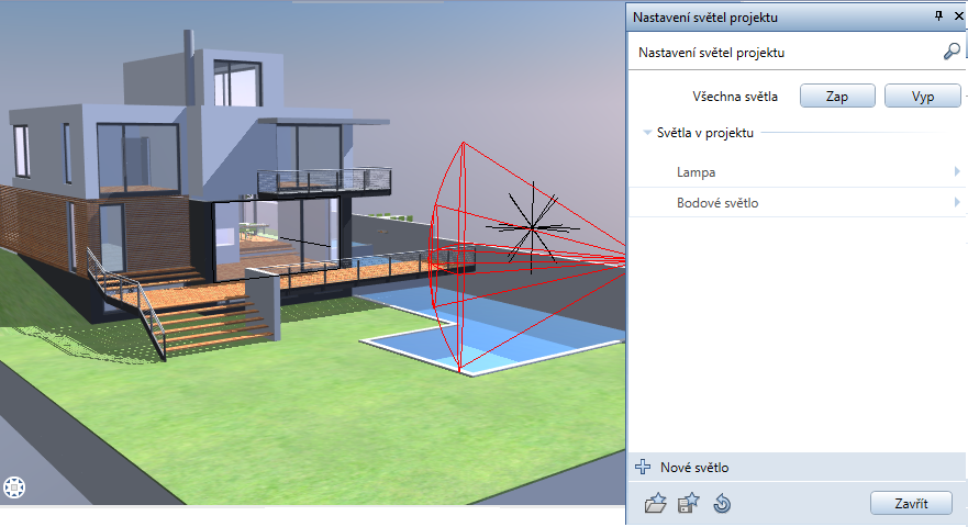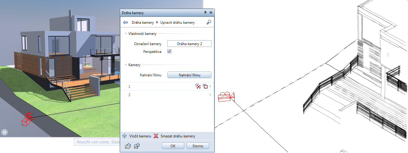 Pokud v paletě najedete myší na dráhu kamery nebo na zdroj světla, zobrazí se ve výkresu nebo v okně signální barvou. Tak je okamžitě vidět, jak se projevují případné změny.