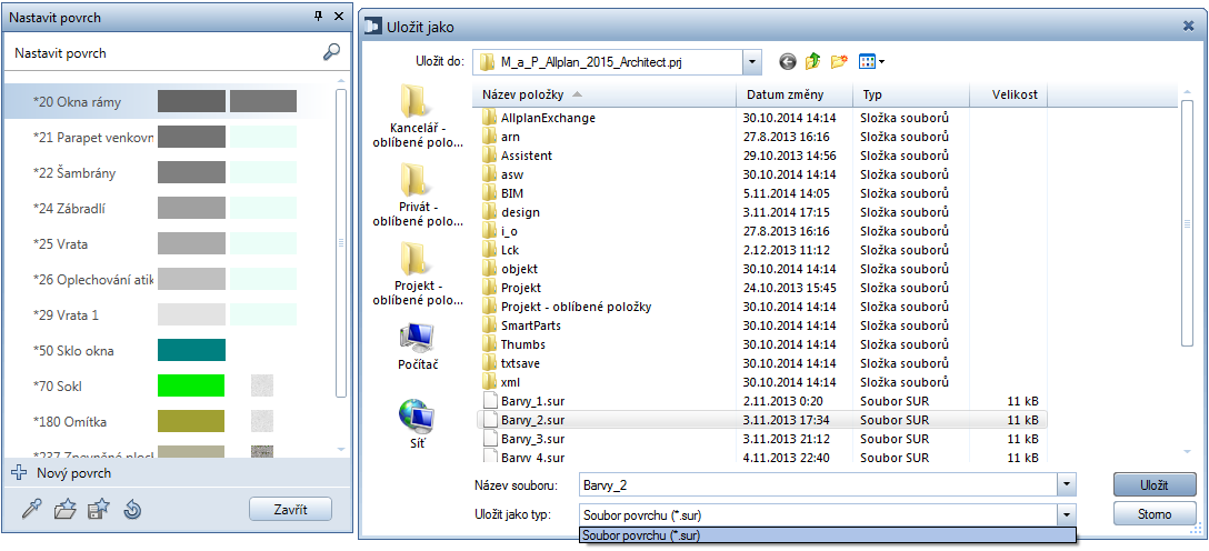 Nastavení povrchu můžete přiřadit každé barvě čáry a pera určité vlastnosti povrchu jako textury včetně lesku, zrcadlení a průhlednosti. Pokud chcete tato přiřazení použít i v předchozí verzi Allplan 2014, pak je můžete uložit jako oblíbené ve formátu Allplan 2014. Nastavení povrchů se přitom převedou do předchozí verze.