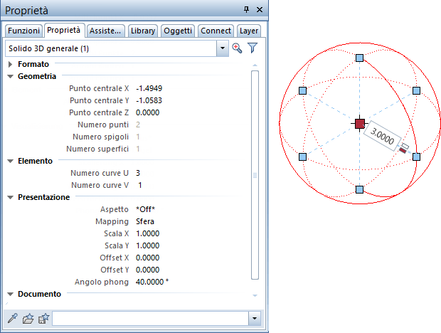 Il raggio e l'altezza di una sfera possono essere cambiati direttamente via grips oppure via campi d'immissione. Nella palette Proprietà sono disponibili ulteriori possibilità di modifica.