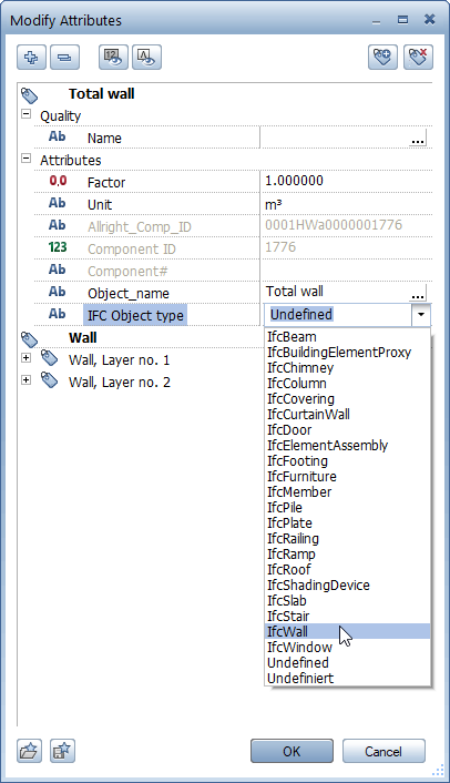 The dropdown list includes the most frequently used 21 IFC object types. If the attribute value you need is missing, click within the line, enter the required attribute value at the keyboard and press ENTER to confirm. The program saves the attribute value entered, presenting it again the next time you select attributes.