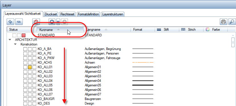 You can sort the Short name and Full name columns on the Select Layer/Visibility, Print Set, Privilege Set and Layer Structures tabs. In addition, you can sort the Short name and Line style columns on the Format Definition tab.