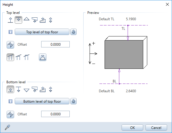 To define the height of an element, click the Height button in the Properties dialog box. You can see the Height dialog box, in which you can define the height of the element’s top and bottom levels.