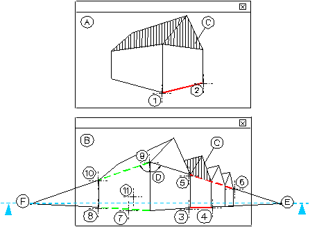 Note: The two vanishing points (E) and (F) must be at the same height.