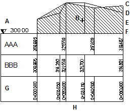 You can display the original status, planning, and spoil status of a terrain in an extract in order to measure the differences in area, for example. To do this, create a profile section for each DTM with an identical clipping line (for example, by using the same bearer element each time). Activate all the drawing files and select the relevant clipping lines.