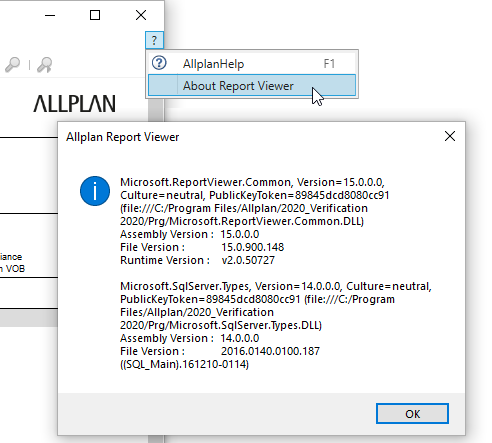 Click the ? symbol in the upper-right corner of Report Viewer to display information on the current version of Microsoft Report Viewer and Microsoft SQL Server Type.