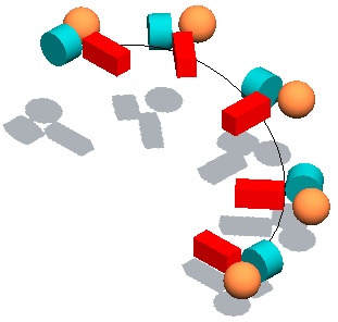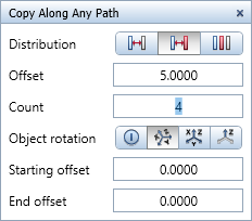 You can use this tool to copy one or more 2D and 3D objects along any 3D paths (3D lines, 3D splines, edges of 3D solids or walls). You can use a part of the path, define a starting offset and end offset and enter the distance between the elements or the number of elements. In addition, you can rotate the elements relative to the path or z-axis.