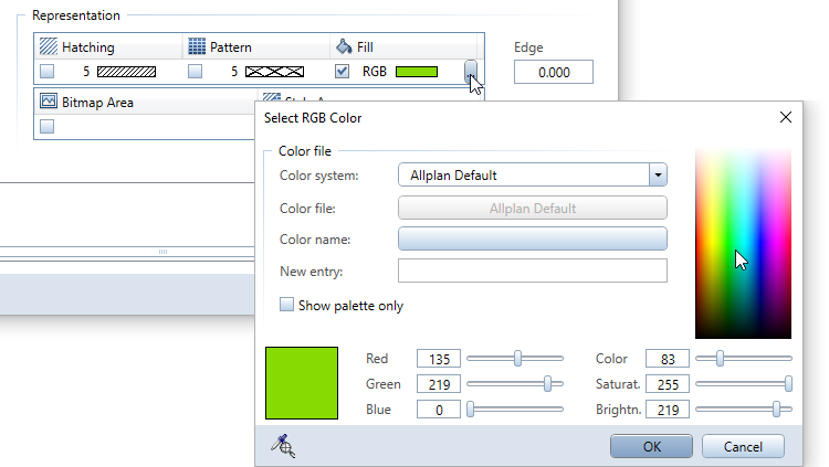 Fill color. Click this button to open the Select RGB Color dialog box. Allplan adds the selected RGB color to the end of the drop-down list. Click