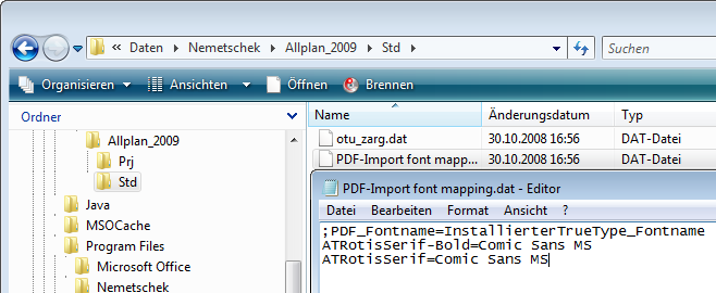 Los usuarios experimentados pueden asignar un tipo de fuente TrueType, a una fuente que falte, durante la importación, editando el archivo Importar fuente PDF.dat en la carpeta STD de Allplan (estándar de estudio).