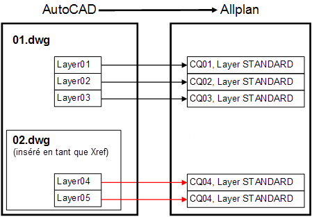 Lors de l'importation : les layers du fichier importé sont répartis sur différents calques et assignés au layer STANDARD. Si le fichier à importer contient des XRef, les layers du fichier XRef ne peuvent pas être répartis sur des calques différents.
