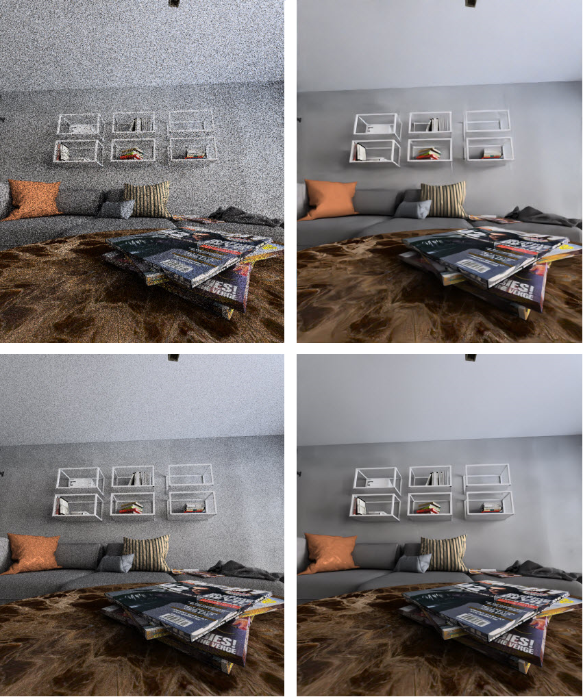 Example of rendering result with RT Denoiser at different levels of noise reduction: