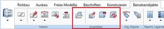Los objetos de SmartPart y las herramientas están integradas en Allplan. Los encontrarás en los módulos Arquitectura, Ingeniería, Modelado y Construcción de puentes - panel Objetos definidos por usuario. Por ejemplo, puedes usar la función