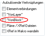 Die Einstellung legt fest, wie Blöcke, die in der .dwg bzw. .dxf Datei mehrfach mit unterschiedlichen Einstellungen eingefügt wurden, übertragen werden (ein DXF-Block, der z. B. einen Tisch beinhaltet, kann bei der ersten Blockeinfügung grün gestrichelt und bei der zweiten rot gepunktet sein). Bei MicroStation gibt es keine entsprechende Einstellung.