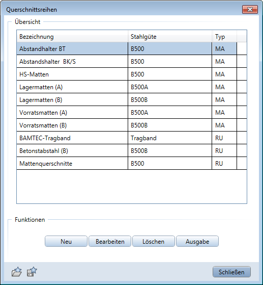 Mit den zur Verfügung stehenden Funktionen können Sie neue Querschnittsreihen definieren, vorhandene modifizieren oder löschen sowie eine Ausgabe der Listenmatten- und Querschnittsreihenübersicht erzeugen.