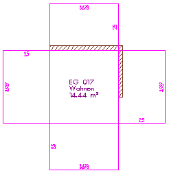 Ist die Option Seitenflächen ermitteln nur an angrenzenden Bauteilen ausgeschaltet (Standardeinstellung), dann werden bei Räumen die Ausbau-Seitenflächen generell von der kompletten Raumgeometrie ermittelt, da häufig Räume auf Basis von 2D-Zeichnungen erstellt werden. Bei Geschossen werden die außen liegenden Ausbau-Seitenflächen über die gesamte Geschoss-Geometrie ermittelt.