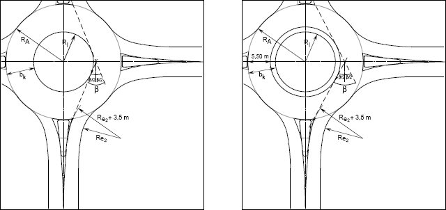 Рекомендуется при всех въездах задавать угол Бета равный, как минимум, 45 гон. В случае узлов с круговым движением, в которых другие элементы проектирования определены не оптимально, недостатки проекта, относящиеся к безопасности, можно компенсировать явным отклонением с помощью центр. островка. Требование, чтобы угол отклонения Бета был не менее 45 гон, при кольцах с четырьмя дорогами, как правило, выполняется при увеличении внешнего диаметра (> примерно 32 м). При проектировании колец с четырьмя дорогами с меньшими внешними диаметрами требуемый угол отклонения можно реализовать, выбрав внутренний радиус средн. островка как минимум вдвое больше ширины дорожного полотна b дороги к кольцу. Эта конструктивная рекомендация предполагает: