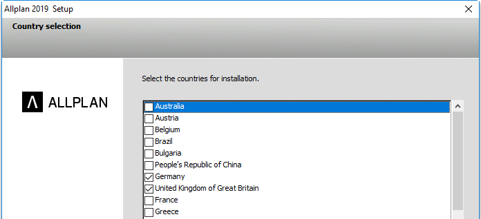 When installing Allplan 2024 for the first time or upgrading from Allplan 2018 or earlier, you must explicitly install the additional country packages. When doing a custom installation, you can select the country packages you want to install. When doing a default installation, Setup only installs the country packages that have already been available. This means that Setup will not install any additional country packages when you install Allplan 2019 for the first time.
