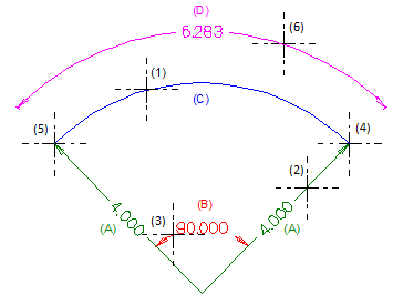 (1) Click on curve(2) Set down radius dimension line(3) Angle dimension line: Through point(4) 1st point(5) 2nd point, ESC(6)..Arc dimensions(A) Radius(B) Angle(C) Arc(D) Arc length