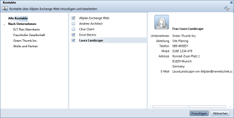 .Das Dialogfeld Kontakte wird geöffnet und zeigt alle Kontakte, die dem aktuellen Projekt über die Webplattform ALLPLAN Exchange Web als Projektbeteiligte zugewiesen sind.