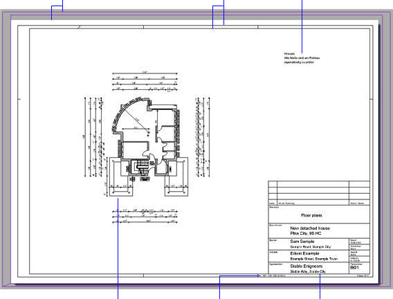 Page and printable area The page represents the area of the layout. The border displays the printable area and the margins of the current output device. The printout includes the documents and elements that are within the printable area of the page and output device. |