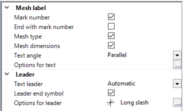 The parameters of the mesh text and the leader can be defined in this area.