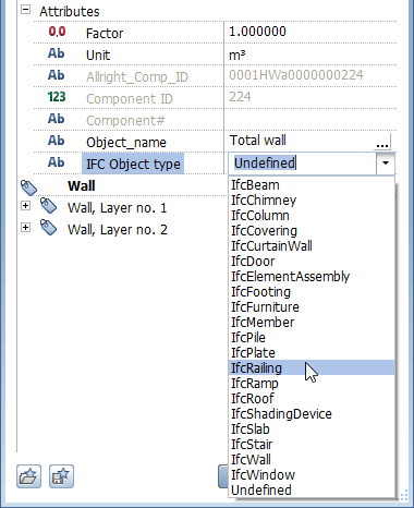 Note: Only use the IFC Entity attribute if you need it. IFC Entity exports the element as a BREP (surface model). ALLPLAN Objects are normally automatically assigned to the appropriate IFC classes (walls, columns, ...). If the assigned IFC Entity corresponds to the native ALLPLAN object type then the program ignores the assignment, trying to transfer the element not as a BRep. This prevents loss of quality during IFC export.
