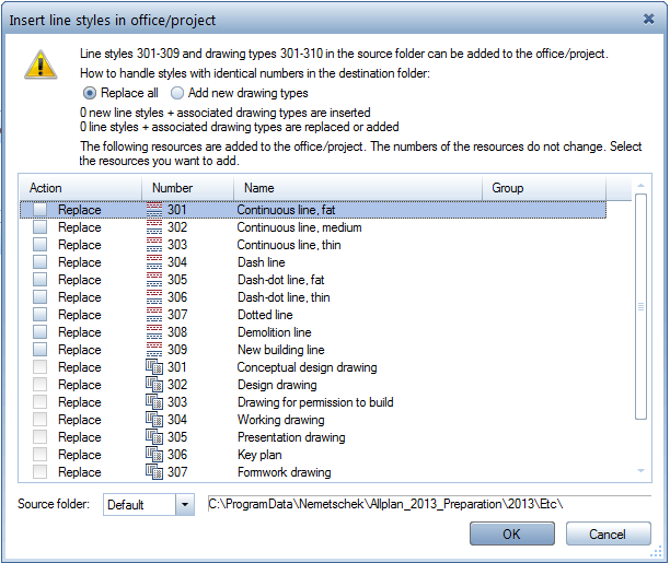 Note: The You are modifying the line styles, area styles and drawing types in the office path message is displayed to remind you that any changes you make will alter the office standard and all projects that are associated with the office standard and that use the line styles, area styles and drawing types you are about to modify. Allplan only displays this message when the paths for the project are set to office.