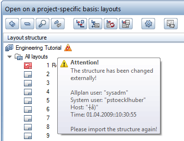 Each user can modify the layout structure. When you have opened the layout structure and another user is modifying it, Allplan displays the flashing