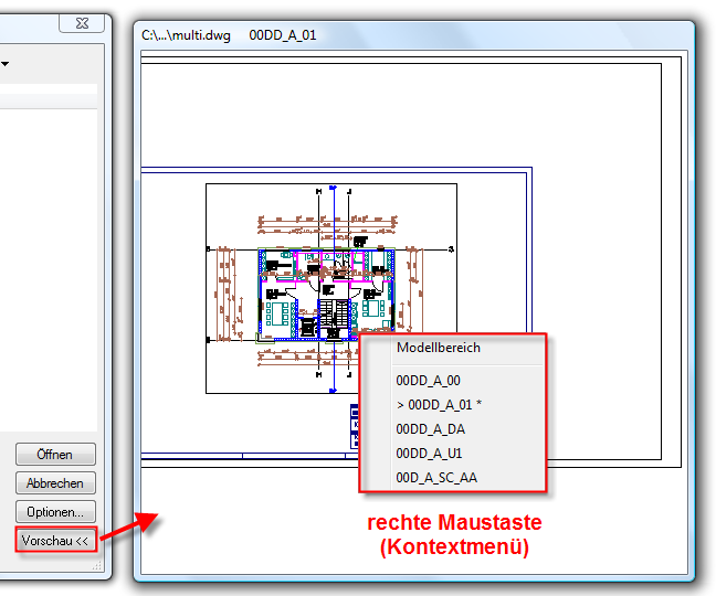 You can use the preview to display the AutoCAD layouts in the file via the shortcut menu.