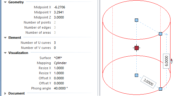 Using handles, you can change the radius and height of a cylinder directly or by entering a value in a data entry box. The Properties palette provides further modification options.